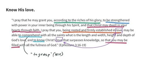 "I pray that he may grant you, according to the riches of his glory, to be strengthened with power in your inner being through his Spirit, and that Christ may dwell in your hearts through faith. I pray that you, being rooted and firmly established in love, may be able to comprehend with all the saints what is the length and width, height and depth of God’s love, and to know Christ’s love that surpasses knowledge, so that you may be filled with all the fullness of God.” (Ephesians 3:16-19)
