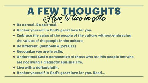 - How to live in exile… be normal. Routine. Be spiritual. (We are not home yet!)