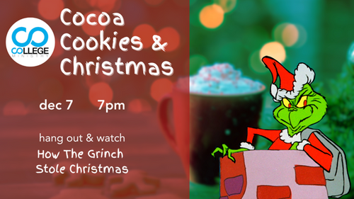 Join us on December 7th at 7:00 pm for the ultimate kick-off to the Northstar Study Sessions. Take a break from the grind and stop by for Cookies, Cocoa, and Christmas. We will have hot cocoa, cookies, and the OG "How the Grinch Stole Christmas" movie.